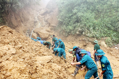 Lực lượng quân đội và dân quân xã La Pán Tẩn tiếp tục tìm kiếm các nạn nhân bị mất tích. Ảnh: Thanh Năm