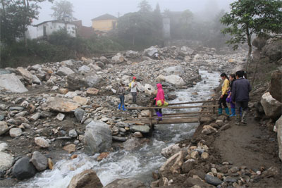 | Chiếc cầu tạm vừa được lực lượng dân quân bắc qua suối sáng nay để giúp học sinh tới trường khai giảng ngày 9-9 |
