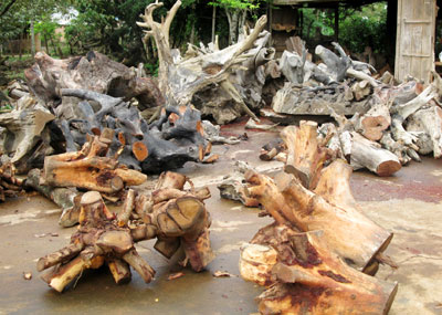 Gốc cây cà te và giáng hương tập kết trong xưởng chờ chế tác