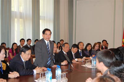 Chủ tịch nước Nguyễn Minh Triết đã có cuộc gặp gỡ cộng đồng người Việt Nam tại Bê-la-rút. Đại diện gần 300 bà con kiều bào đã đến chào Chủ tịch nước tại biệt thự Da-xláp. Chị Lê Thị Bích Châm, Phó chủ tịch Hội người Việt Nam tại Bê-la-rút cho chúng tôi biết: "Ở Bê-la-rút cộng đồng người Việt Nam được tổ chức khá chặt chẽ. Anh chị em sống với nhau rất đoàn kết và thường xuyên thông tin về nhau. Ai gặp khó khăn đều được Đại sứ quán, Hội cộng đồng người Việt Nam giúp đỡ. Mới đây, chúng tôi đã khai trương Trung tâm văn hóa cộng đồng Việt Nam tại Bê-la-rút. Đây sẽ là địa điểm để cộng đồng người Việt Nam gặp gỡ, giao lưu, trao đổi thông tin với mục đích tạo ra sợi dây liên kết vững chắc trong cộng đồng...". Còn sinh viên Phạm Quang Lợi đang học cao học tại Đại học tổng hợp Min-xcơ thì nói với chúng tôi: "Chúng em sang đây học tập với mong muốn đem được thật nhiều kiến thức về xây dựng quê hương, đất nước. Hôm nay được gặp Chủ tịch nước và các chú, các bác lãnh đạo Đảng, Nhà nước tại đây, chúng em rất mừng. Chúng em phấn đấu học thật giỏi để khỏi phụ lòng mong mỏi của các bác, các chú...".