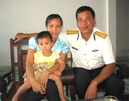| Thượng úy Trần Văn Tiên bên vợ và con trai trước ngày lên đường ra nhà giàn DK1/12. |