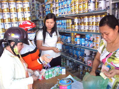 | Chị Trịnh Thị Lý (thứ 3, từ trái qua), vợ của Trung tá Nguyễn Văn Hùng – Chỉ huy trưởng nhà giàn DK1/14 giới thiệu sản phẩm sữa Hà Lan với khách. |