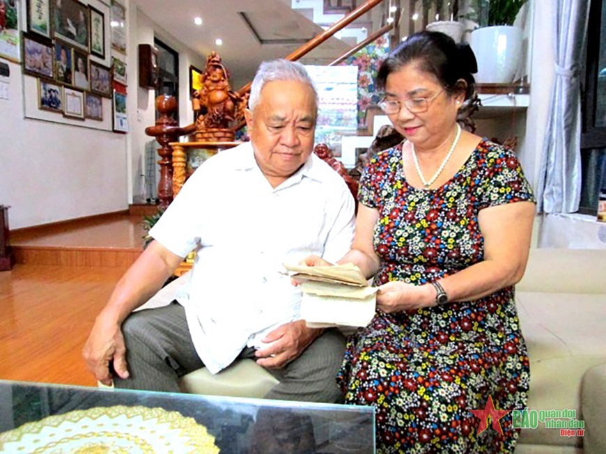 | Vợ chồng CCB Phạm Xuân Quý nâng niu những bức thư tình đã ố vàng theo năm tháng. |