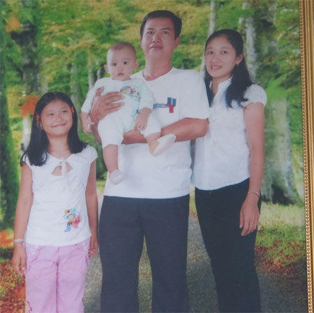 Đồng chí Lê Hữu Thụy chụp ảnh cùng gia đình trước ngày đi làm nhiệm vụ ở Trường Sa. (Ảnh chụp lại)