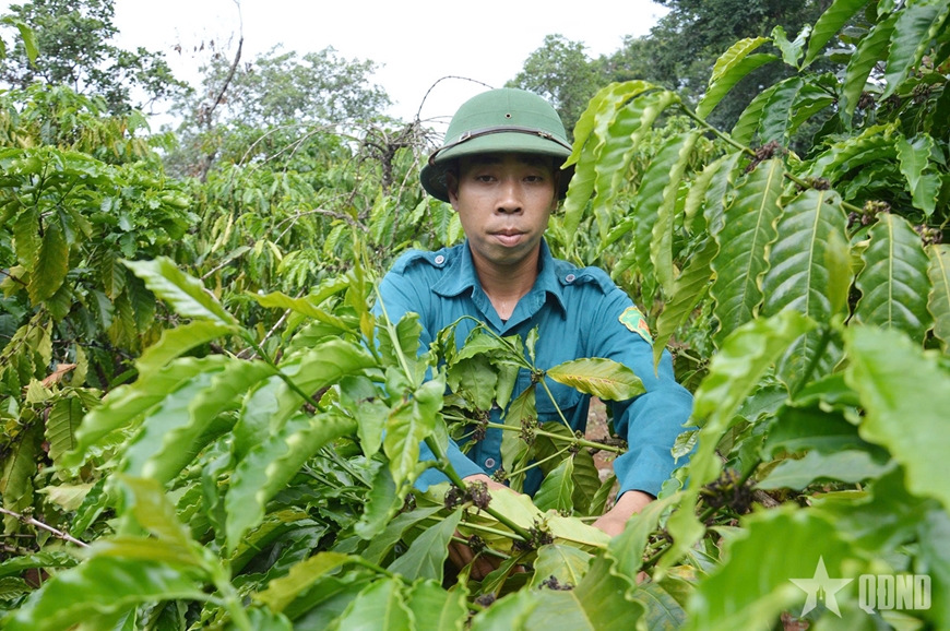 Khi tròn 18 tuổi, anh xin vào làm công nhân của Trung đoàn 720. Gian nan không làm chùn bước người thanh niên trẻ. Anh nhận khoán của đơn vị 1ha cà phê, rồi mạnh dạn mua thêm 5ha đất đồi, trồng cà phê xen điều làm bóng mát, cho hồ tiêu leo lên thân điều và trồng xen sầu riêng. “Đất đỏ hợp sầu riêng lắm, chỉ cần chăm tốt là cây cho quả. Mình làm để thử sức và cũng để tạo hướng mới cho đồng đội”, anh chia sẻ.