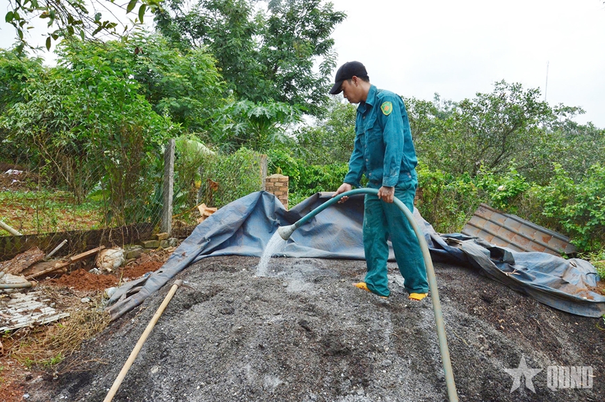 Đồng chí Bùi Mai Ngọc chế biến phân hữu cơ từ vỏ trấu cà phê. |