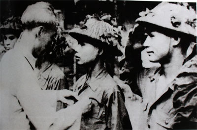 Chủ tịch Hồ Chí Minh gắn huy hiệu cho chiến sĩ Hoàng Đăng Vinh, người bắt sống tướng Đờ Cát trong Chiến dịch Điện Biên Phủ. Ảnh tư liệu.