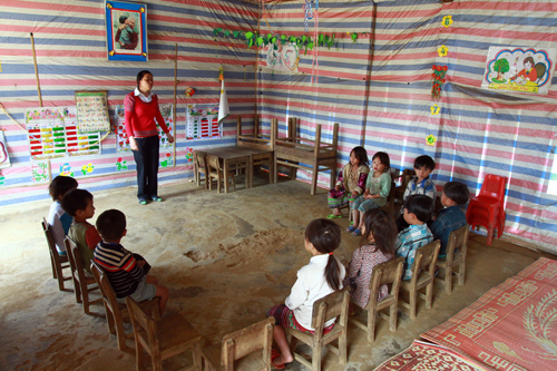 | Lớp học được quây bạt xung quanh để chắn gió; buổi trưa các em nằm ngủ trên những tấm gỗ kê sát đất. |