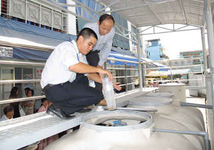 Cán bộ y tế tham quan mô hình thí điểm về xử lý nước thải y tế ở phường 21, quận Bình Thạnh, TP Hồ Chí Minh.