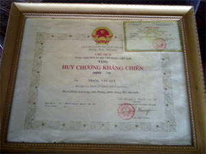 Bằng chứng nhận huy chương Kháng chiến hạng nhì của ông Trang Văn Lũy.