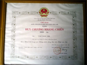 Bằng chứng nhận huy chương Kháng chiến hạng nhì của ông Cao Ngọc Phi.