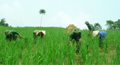 Bộ đội Đồn Biên phòng 409 cùng bà con dân bản Nậm Là, xã Mường Nhé làm cỏ trên nương lúa.