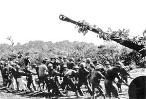 Quân, dân hợp sức kéo pháo lên đồi. Ảnh tư liệu.