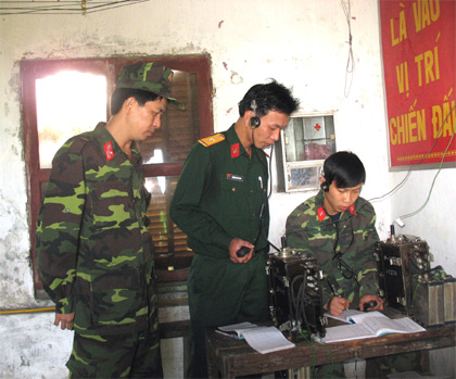 | Các chiến sĩ trạm thông tin T2 trong ca lên máy. |