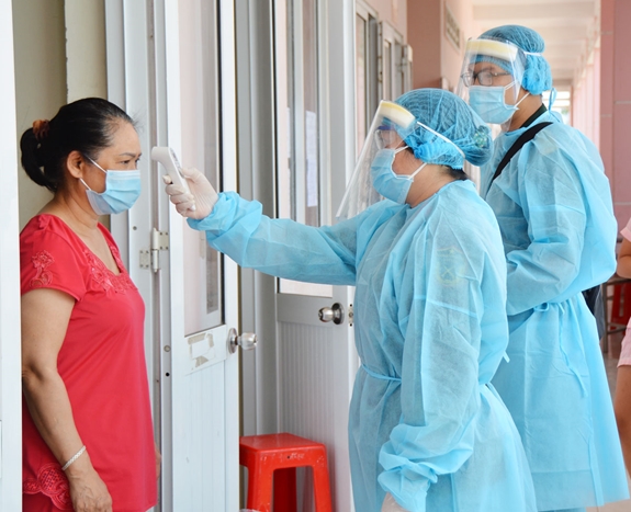 | Kiểm tra sức khỏe cho công dân tại khu cách ly Trường Quân sự Quân khu 9. |