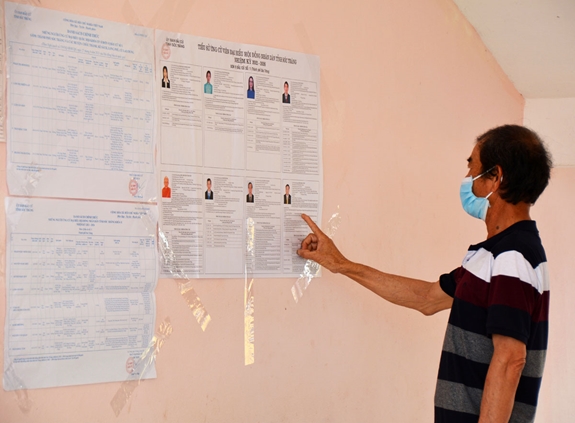 | Công dân tìm hiểu tiểu sử các ứng cử viên tại khu cách ly. |