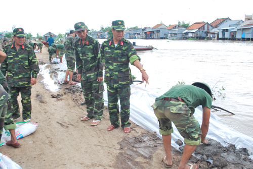 Đại tá Lê Mạnh Thường kiểm tra, chỉ đạo bộ đội và Dân quân gia cố đê bao tuyến kinh Vịnh Tre xã Ô Long Vĩ huyện Châu Phú. Ảnh: Đăng Hải