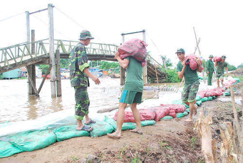 Bộ đội Trung đoàn 1 – Sư đoàn 330, Quân khu 9 và các lưc lượng bộ đội địa phương, dân quân tự vệ tham gia giúp dân bảo vệ tuyến đê kinh Hào Đề xã Mỹ Đức huyện Châu Phú. Ảnh: Đăng Hải