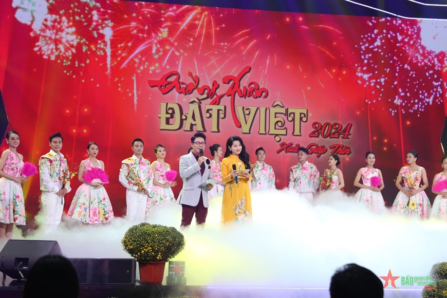 | Thu Hoàn cùng bạn dẫn tại chương trình Đường Xuân đất Việt 2024. |