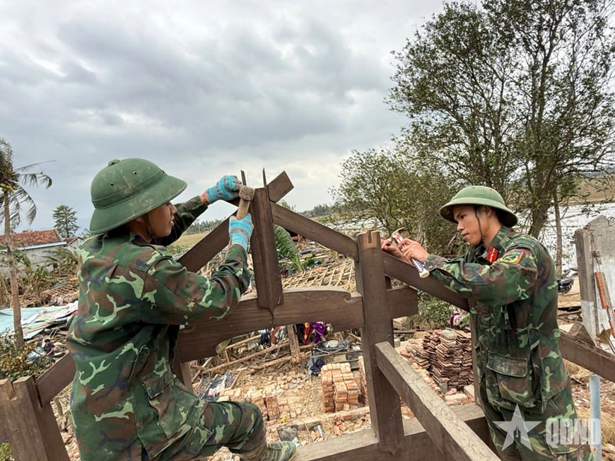 Trên đường đưa chúng tôi sang nhà các anh Trần Hoàng Long, Trần Xuân Hội, Trần Chú Nghĩa (con trai ông Khánh) và hai hộ dân khác cùng ở Đội 3 có nhà bị đổ sập hoàn toàn vừa được bộ đội hỗ trợ vật tư, nhân lực làm nhà tạm, Thượng tá Võ Đức Cương, Phó sư đoàn trưởng, Tham mưu trưởng Sư đoàn 315, cho biết: “Với các hộ dân đã có sẵn mặt bằng, vật liệu, việc dựng nhà tạm, lán trại giúp họ được bộ đội triển khai thực hiện rất nhanh. Còn với các gia đình không có quỹ đất dự phòng, chúng tôi phải thu dọn hiện trường, đào bỏ nền móng cũ nên khá mất thời gian. Để đẩy nhanh tiến độ giúp dân, những ngày qua, bộ đội thường xuyên phải thức khuya, dậy sớm, làm việc xuyên trưa, ăn uống, giải lao ngay tại chỗ. Hiện nay, ngoài việc sửa nhà, làm nhà tạm cho bà con, cán bộ, chiến sĩ của Sư đoàn còn tham gia hỗ trợ 6 trường học, 41 hộ dân, 12 thôn, xóm ở Hòa Thịnh, Đông Hòa tổng dọn vệ sinh, sửa chữa các công trình, thiết bị hư hỏng. Làm được gì cho bà con, bộ đội sẽ cố gắng làm thật tốt”.