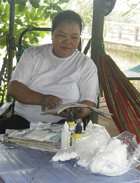 Chị Đỗ Thị Kim luôn sẵn sàng cứu người với các dụng cụ cứu thương thô sơ của mình.