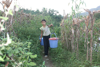 Không thể đi hết các gia đình, chúng tôi chỉ đến được bốn hộ dân quanh đó, nhà ai cũng cảnh thiếu nước. Đến phân trường tiểu học và mầm non Nà Bản trên một mỏm núi cao, những gian nhà tạm bợ bằng tre, nứa. Trong nhà chúng tôi nhìn thấy 4, 5 chiếc thùng nhựa to loại từ 100 đến 200 lít, có lẽ do điều kiện kinh tế của các thầy cô nơi đây khá giả hơn nên mua được, chứ trên 90% hộ người Mông hạt thóc, củ khoai còn thiếu thì… Cô giáo Nông Thị Nhuận cho biết: “Cái khó khăn của giáo viên cắm bản thì ở đâu cũng vậy, nhưng ở đây chúng tôi thấy cảnh thiếu nước làm cuộc sống, sinh hoạt quá vất vả, nhất là đối với chị em phụ nữ, hàng ngày đi lấy nước suối xa gần 500 mét, chúng tôi thấy quý nước suối như những người lính ở Trường Sa quý nước ngọt vậy”. Nói rồi chị nhoẻn miệng cười, trong nụ cười của chị phảng phất nỗi buồn. Trên đường ra chúng tôi gặp em Dương Thị Dậu, một học sinh lớp 5, đôi vai gầy của em đung đưa gánh nước. Dậu cho biết, do bố mẹ phải lên nương nên ngày nào em cũng phải gánh hai gánh nước trên đoạn đường khá xa từ suối về nhà.