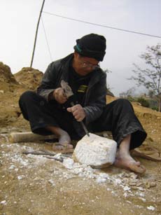 Ông Sùng Phì Sinh đẽo đá để dựng chuồng trâu trên núi