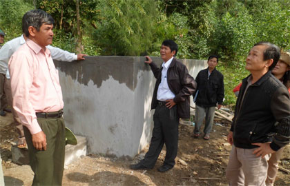 | Ông Phạm Văn Bút (ngoài cùng bên trái) cùng cán bộ cơ quan chức năng đi khảo sát nguồn nước sạch trên địa bàn xã. |