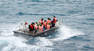 Dù biển động, sóng lớn nhưng đoàn công tác luôn cố gắng hết sức để chuyển hàng Tết và quà tặng vào đảo
