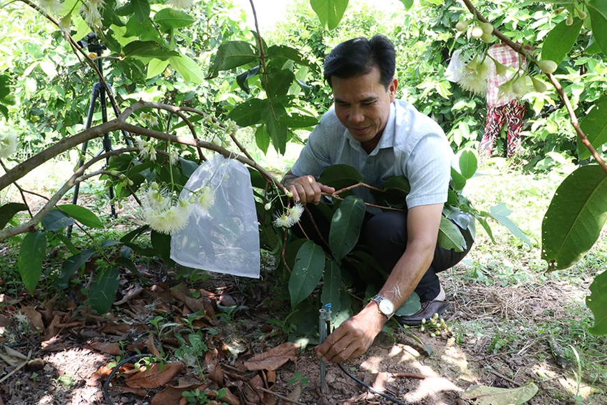 | Hệ thống tưới nước và dinh dưỡng đa năng được anh Phục cải tiến, giúp cây mận phát triển tối ưu. |