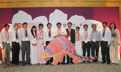Thí sinh đội tuyển Olympic Sinh học Việt Nam cùng thầy cô giáo tại lễ trao giải Olympic Sinh học quốc tế năm 2012 tại Xin-ga-po. Ảnh: Ngọc Hồng.