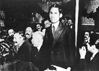 | Nguyễn Ái Quốc phát biểu tại Đại hội đại biểu toàn quốc lần thứ 18 Đảng Xã hội Pháp, ủng hộ Luận cương của Lê-nin về vấn đề dân tộc và thuộc địa. Ảnh: TL. |