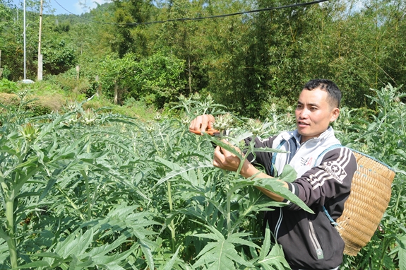 | Anh Má A Thào là người tiên phong mở rộng diện tích trồng cây atisô và rau trái vụ ở thôn Má Tra. |