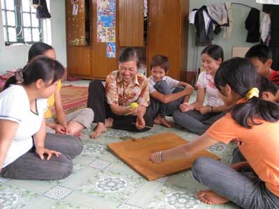 | Mẹ Toàn dạy các con chơi chuyền. |