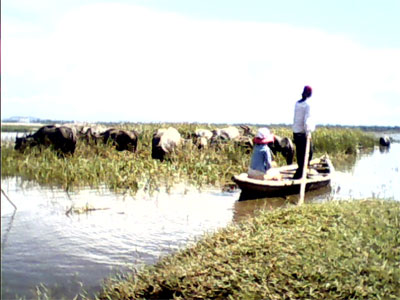 Cuộc “đuổi bắt” 34 chú trâu ương ngạnh mỗi khi chiều về khi chúng còn đang say cỏ nên cứ chạy bên này lại chạy sang bên kia, người chăn trâu vừa chống ghe, vừa đánh trâu dồn lại để lùa vào bờ. Tiếng la hét, gọi trâu nghe inh ỏi cả một vùng sông Đầm.