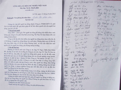 Đơn kiến nghị của công nhân Công ty Cà phê Gia Lai gửi Cơ quan Báo QĐND tại Gia Lai.