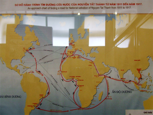 | Sơ đồ hành trình tìm đường cứu nước của Nguyễn Tất Thành từ 1911-1917. Ảnh: Nguyễn Hồng. |