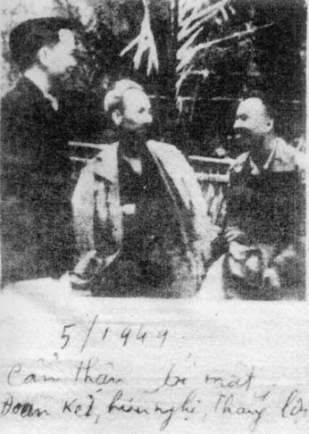 Bác Hồ căn dặn đồng chí Lê Quảng Ba (bên phải) trước khi lên đường sang Thập vạn đại sơn giúp bạn, với dòng chữ tự tay Người viết: “Cẩn thận, bí mật, đoàn kết, hữu nghị, thắng lợi”, ghi tháng 5-1949. Ảnh tư liệu