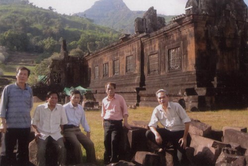 Tác giả (thứ 3, từ trái sang) và các đồng đội cũ trong một lần thăm đền Wat Phou ở tỉnh Chăm-pa-sắc. Ảnh: Quang Tuấn.