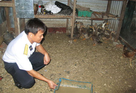 Trung úy QNCN Lê Anh Thư chăm sóc đàn vịt, gà được ấp nhân tạo trên đảo Trường Sa Đông.