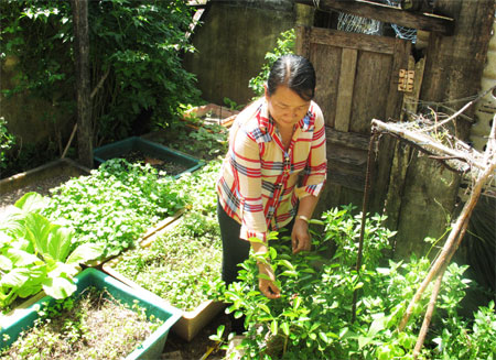 Chị Nguyễn Thị Thanh Thúy và vườn rau gia vị của gia đình ở đảo Trường Sa. Ảnh: Đặng Kiên