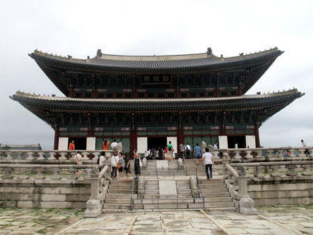 Giữa dòng xe cộ tấp nập, hàng nối hàng của một thành phố hơn 10 triệu dân, bỗng nhiên chúng ta bắt gặp khoảng lặng như nốt nhạc lên cao rồi xuống trầm, đó là khung cảnh trầm mặc của Cung điện Gyongbok, nơi ghi dấu triều đại phong kiến Chosun. Cung điện nằm giữa thành phố, lọt thỏm trong những tòa nhà cao tầng, về cơ bản được phục dựng lại mới vài chục năm gần đây. Chiến tranh, ly tán, đất nước bị chiếm đóng đã tàn phá nặng nề những công trình kiến trúc quý báu của người dân Hàn Quốc. Khi nền kinh tế được phục hồi, họ bắt tay xây dựng lại trên nền những thành quách xưa với hình hài, kiến trúc gần như không thay đổi so với hàng trăm năm trước.