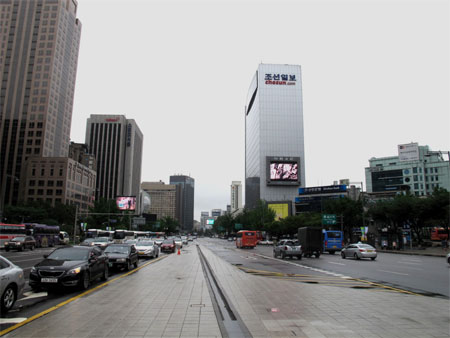 Đường phố Xơ-un tấp nập xe cộ giữa những tòa nhà cao tầng.