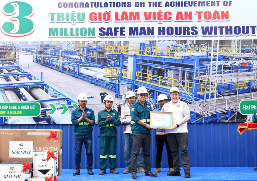 Kỹ sư Hà Văn Đức thay mặt Đội thi công số 2, Tổng công ty Lắp máy Việt Nam-CTCP nhận chứng nhận 3 triệu giờ làm việc an toàn tại dự án gia công chế tạo và lắp đặt mô đun điện phân cho các dự án sản xuất hydro xanh.