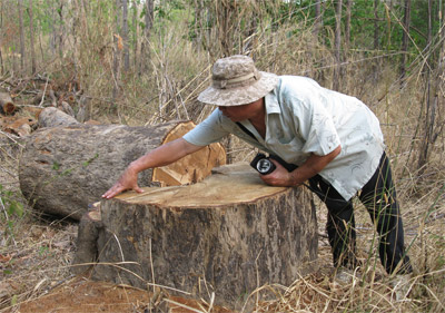 Cây gỗ giáng hương có đường kính gốc 1 m, thân dài 10m, khối lượng 6m3 bị lâm tặc đốn hạ tháng 3-2011 tại tiểu khu 434