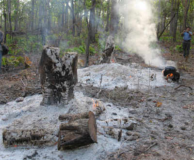 Gốc gỗ hương vườn Yok Đôn bị đốt bỏ, sau khi lâm tặc đốn hạ và lấy hết gỗ