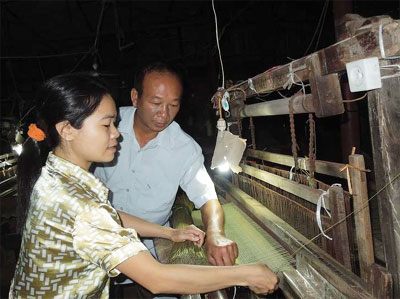 Anh Đinh Văn Tỉnh đang hướng dẫn chị Thân Thị Cảnh, ở thôn Phúc Tằng dệt mành tre xuất khẩu