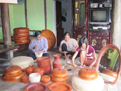 Đến thăm làng nghề Tăng Tiến, điều làm chúng tôi thật ấn tượng là, buổi trưa bên lũy tre làng hay dưới mái hiên nhà, có nhiều người già, người trẻ cùng ngồi đua “tài” đan rổ, đan rá…