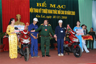 - Năng suất mủ cao su của công ty chúng tôi hiện đang cao nhất so với các đơn vị cùng Binh đoàn, điều này là thực tế. Để có năng suất cao như tôi đã nói là nhờ việc áp dụng các tiến bộ khoa học vào sản xuất và quản lý. Song có một điều mà tôi tâm đắc nhất chính là yếu tố con người. Luyện tay nghề, thi thợ giỏi ở công ty chúng tôi đã trở thành phong trào thường xuyên, liên tục. Chính nhờ phong trào này mà chúng tôi có đội ngũ thợ cạo mủ cao su lành nghề. Kỹ thuật cạo đúng, cạo giỏi không chỉ cho năng suất mủ cao, mà còn kéo dài tuổi khai thác của cây cao su. Đồng nghĩa với đó là lương của công nhân, của người lao động cao hơn những nơi khác là điều hiển nhiên.