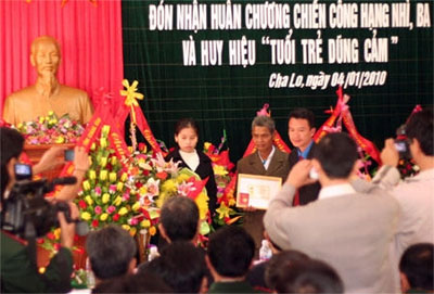 | Lễ đón nhận Huy hiệu “Tuổi trẻ dũng cảm” truy tặng Trung úy liệt sĩ Hồ Thoong. Ảnh:Phùng Văn Hùng |